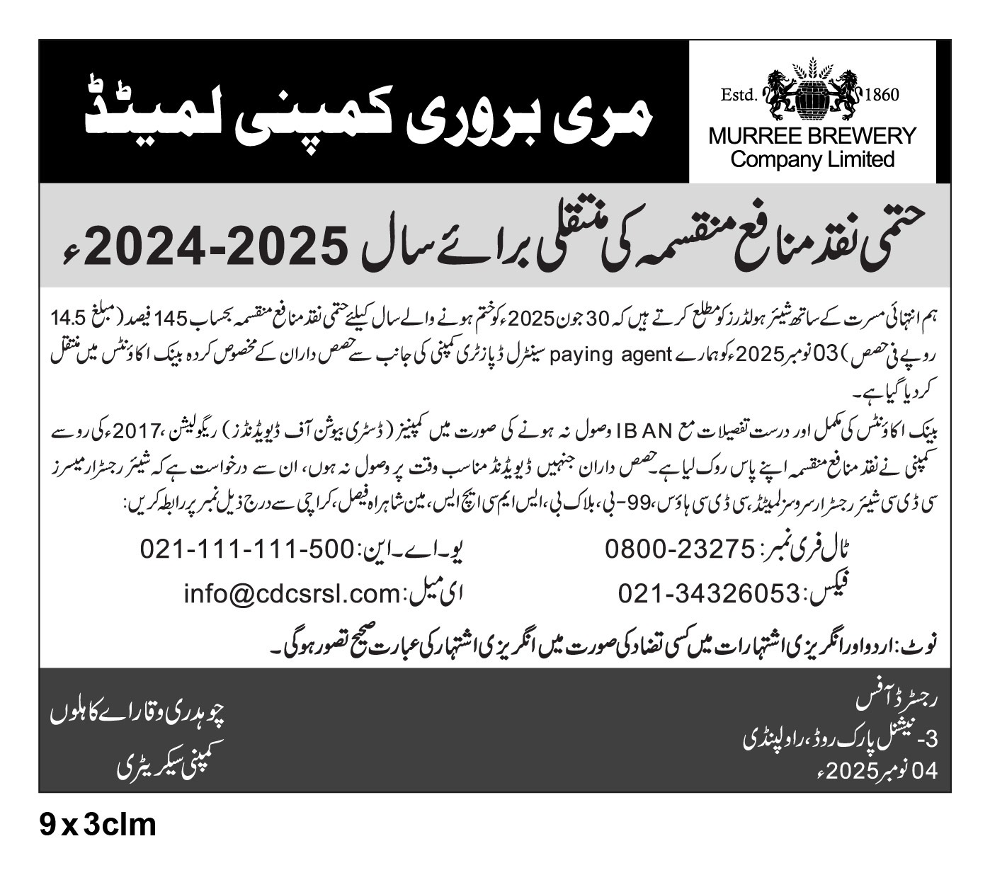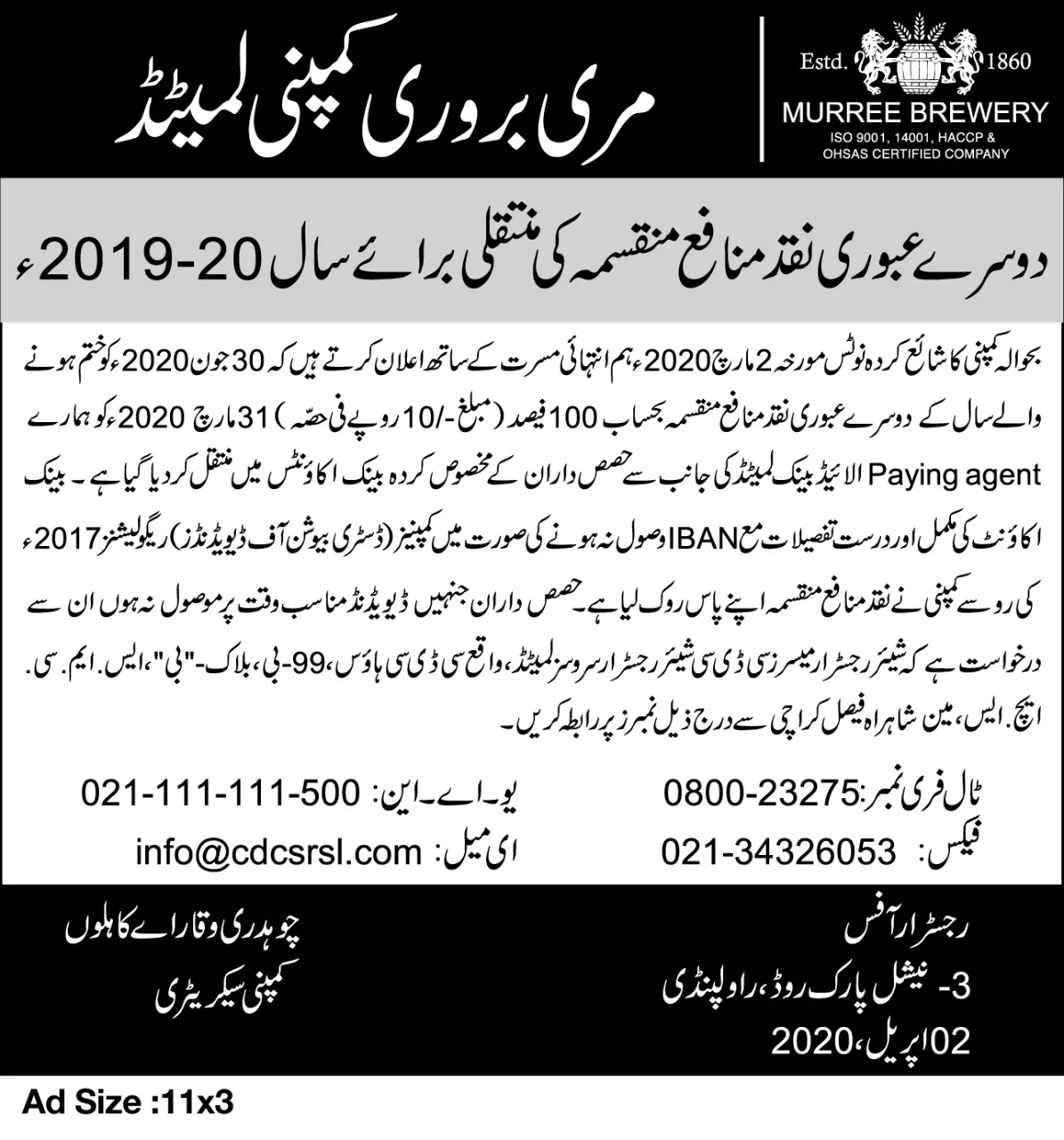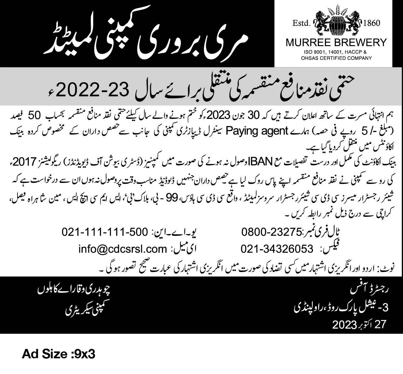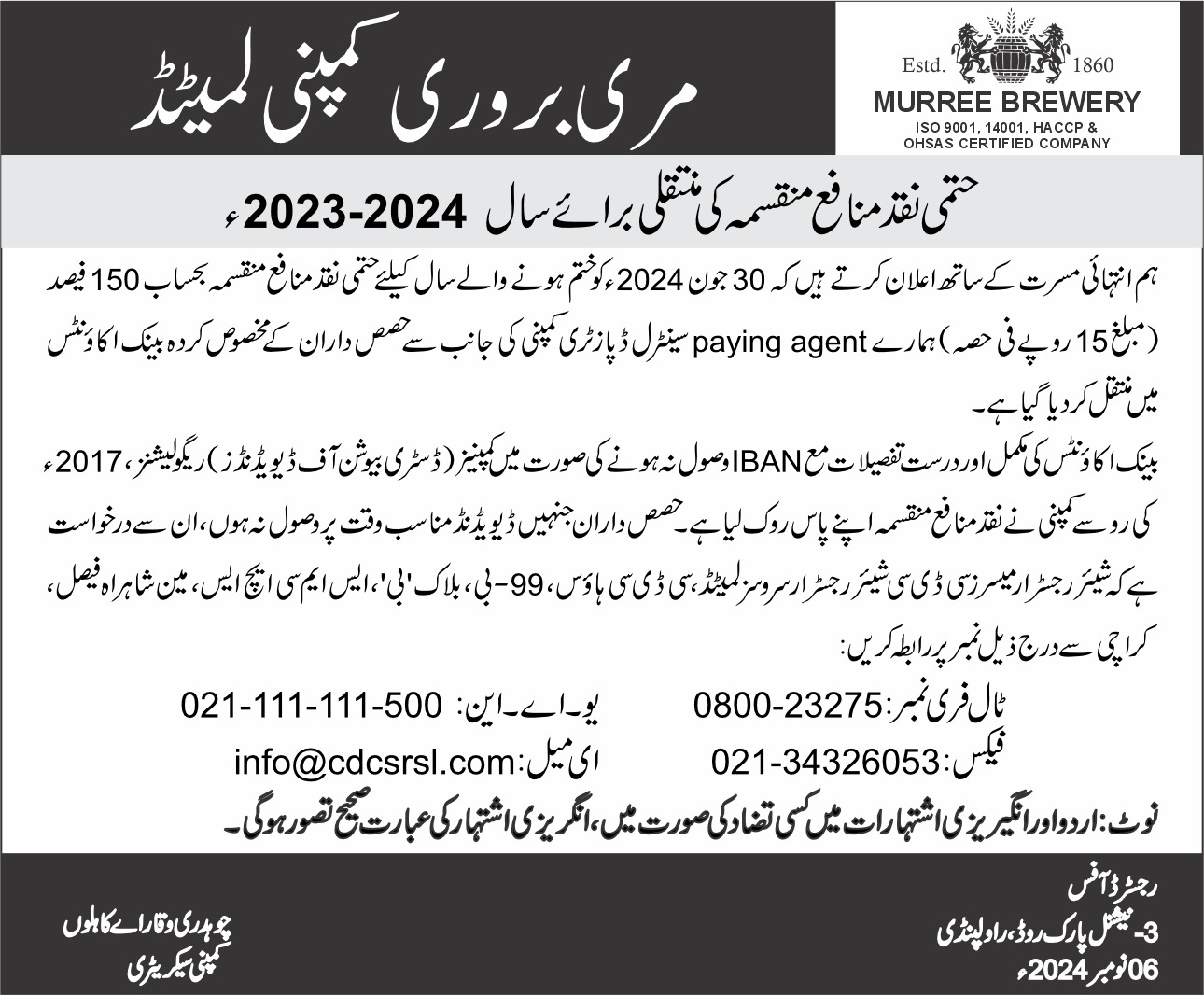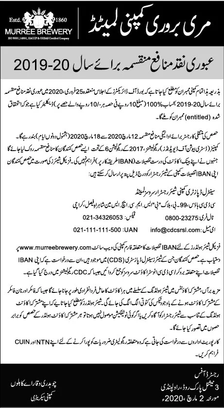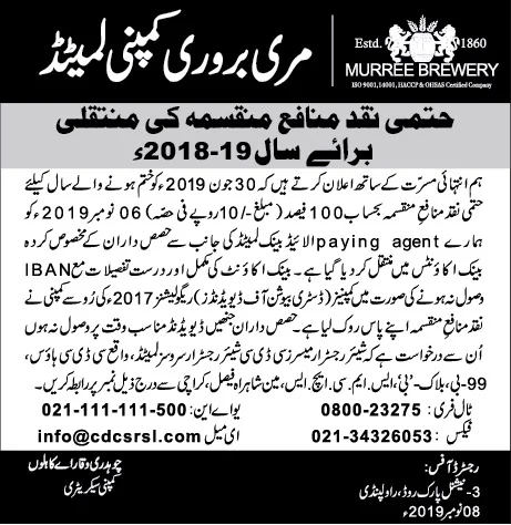 Newspaper advertisements Credit of Final Cash Dividend (URDU)
