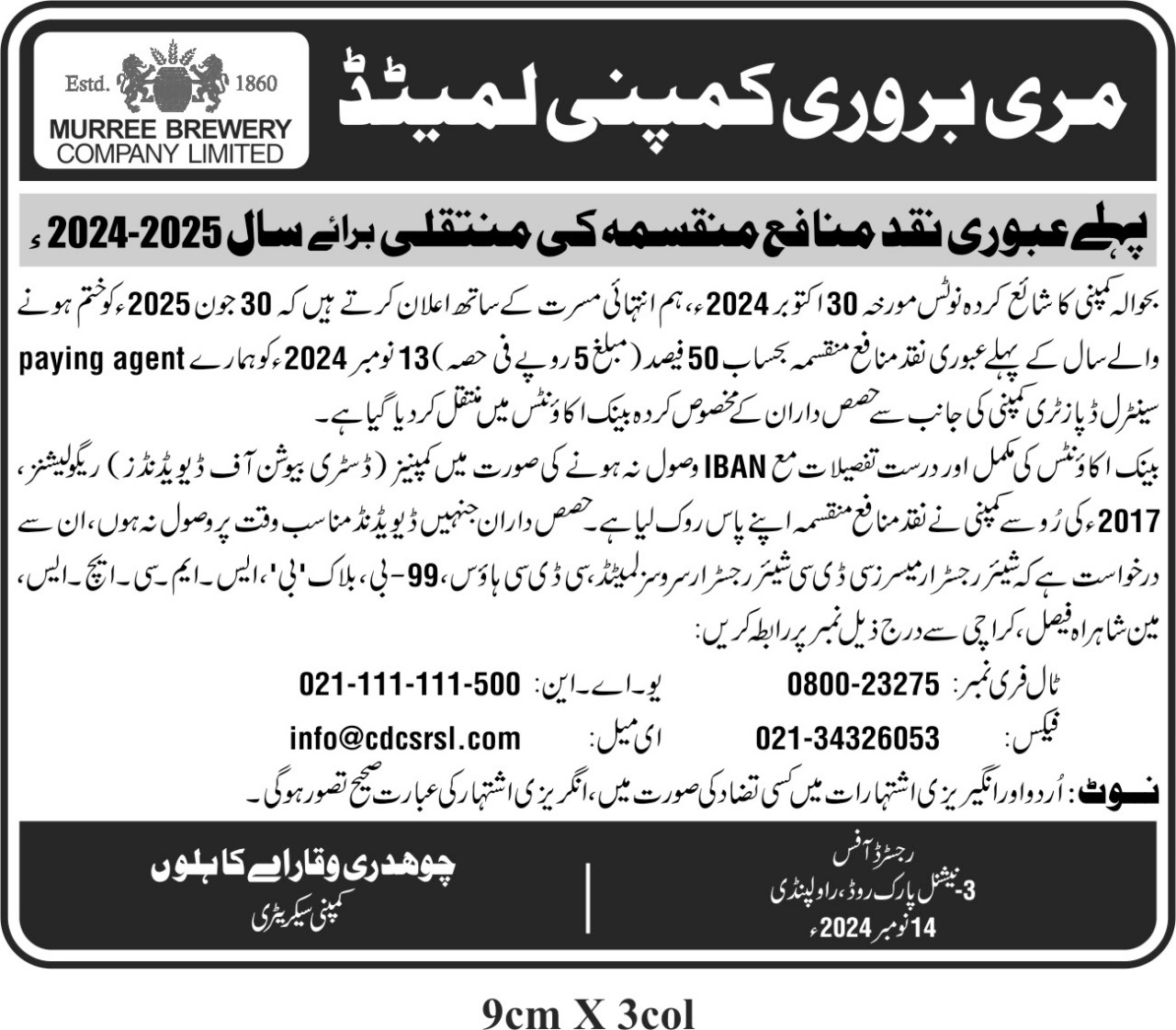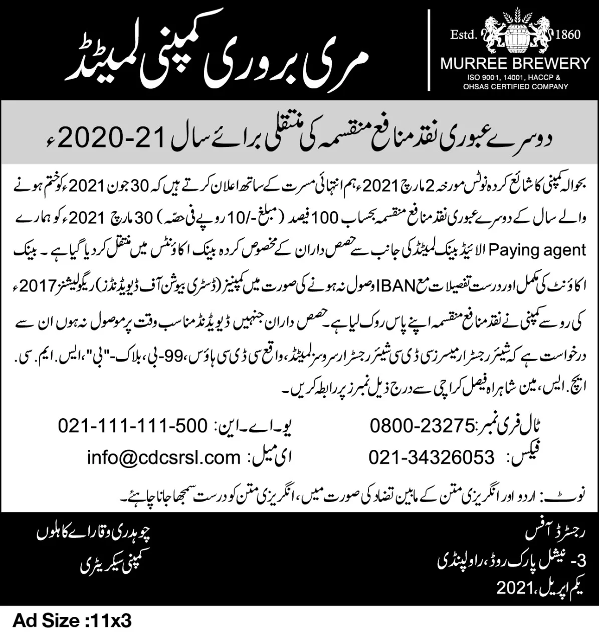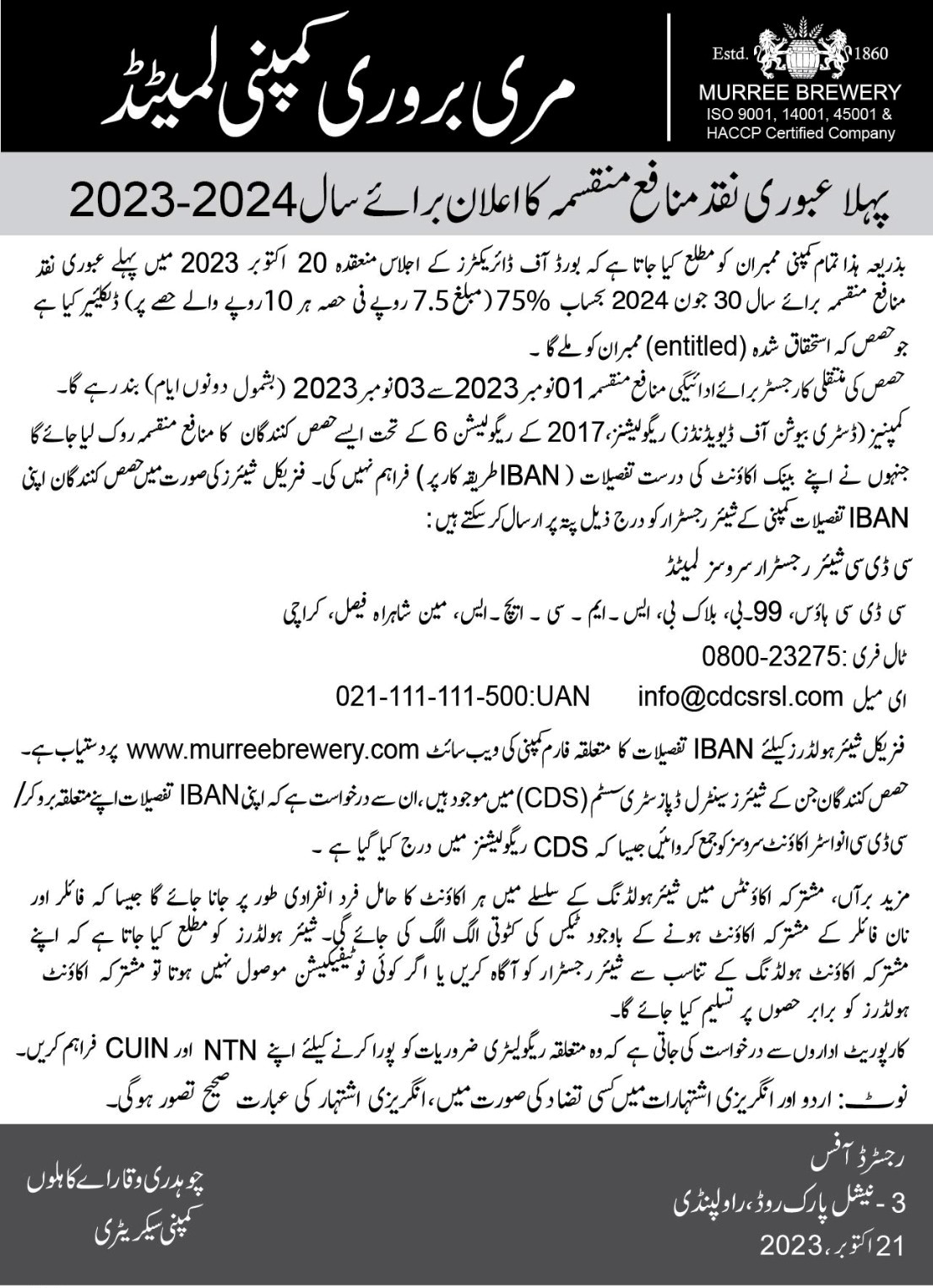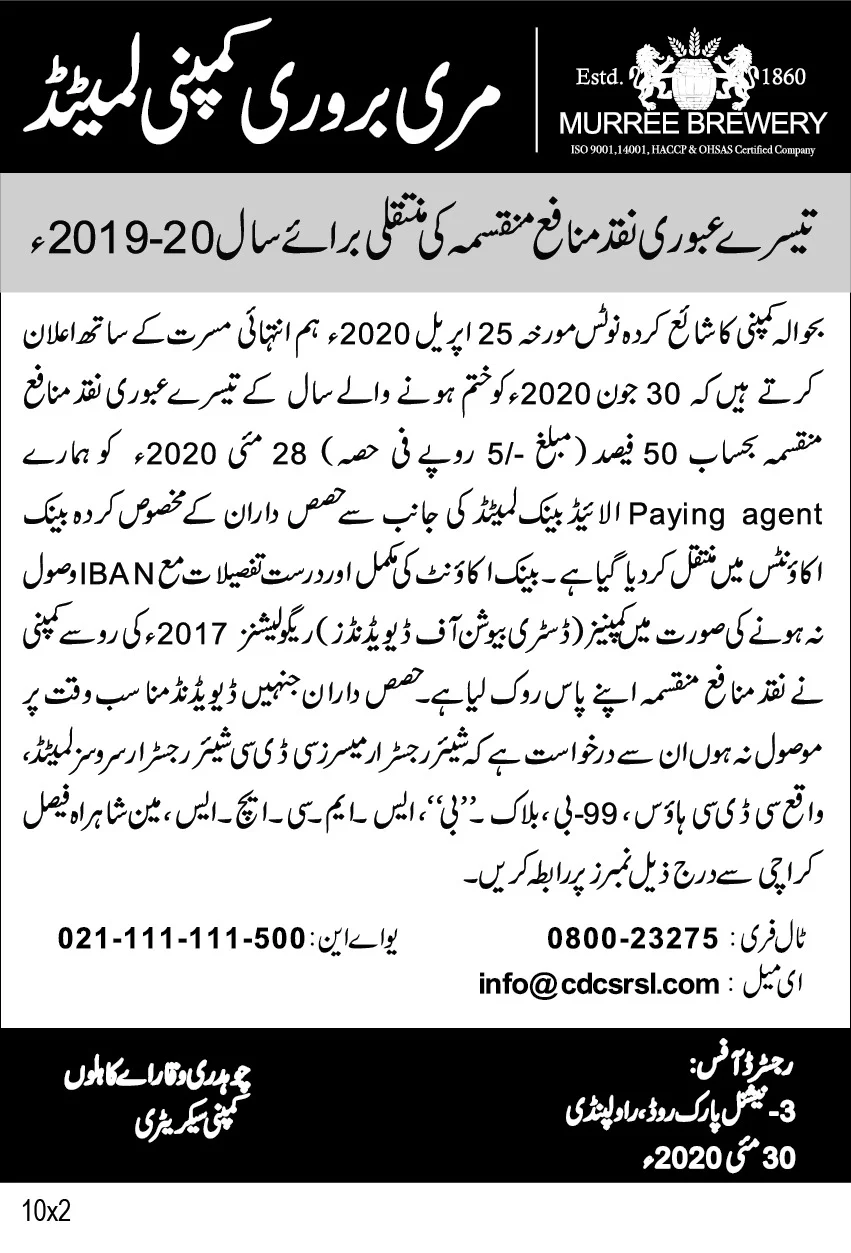 Newspaper advertisements Declaration of 1st Interim Cash Dividend (URDU)