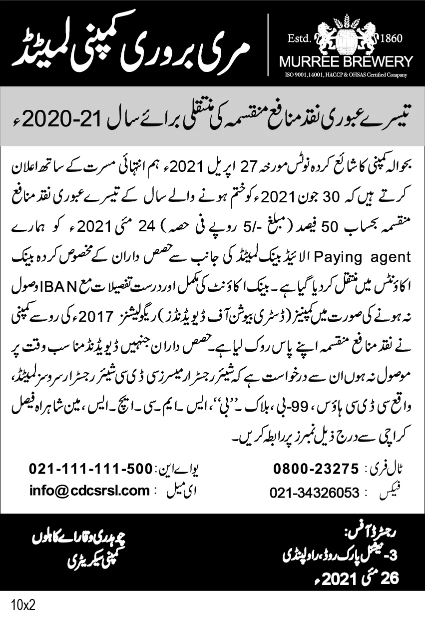 Declaration of 3rd Interim Cash dividend FY-2020-21-Urdu