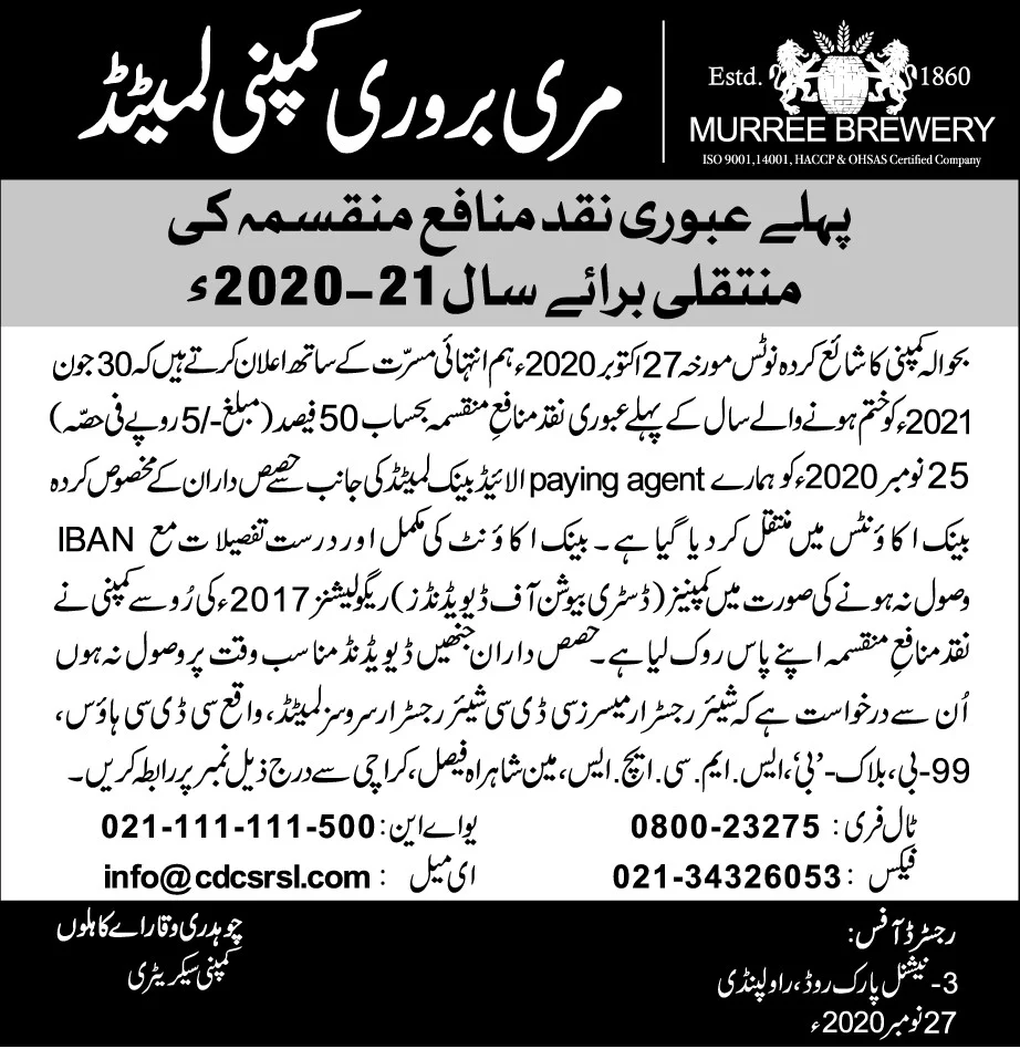 Credit of first Interim Cash Dividend – FY 2020-21 – Urdu