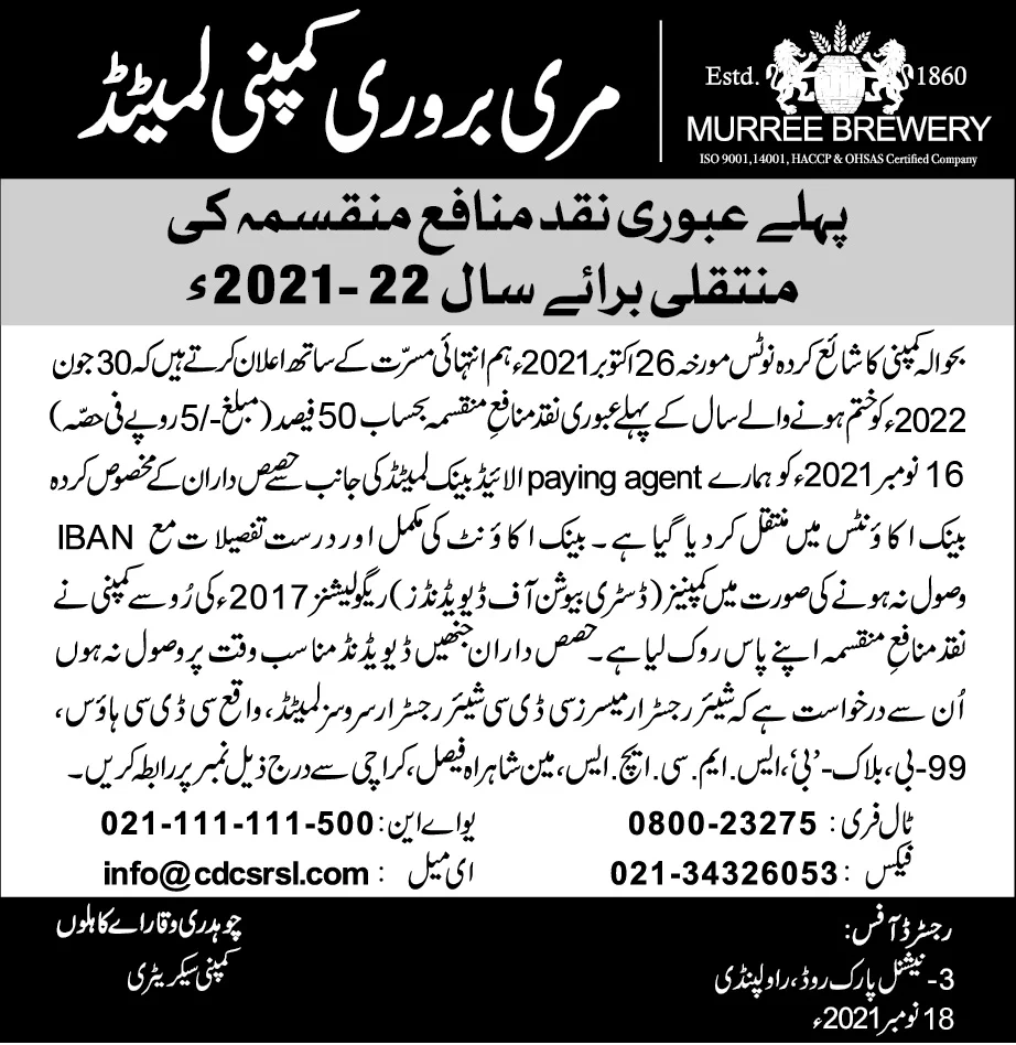 Credit of first Interim Cash Dividend – FY 2021-22 – Urdu