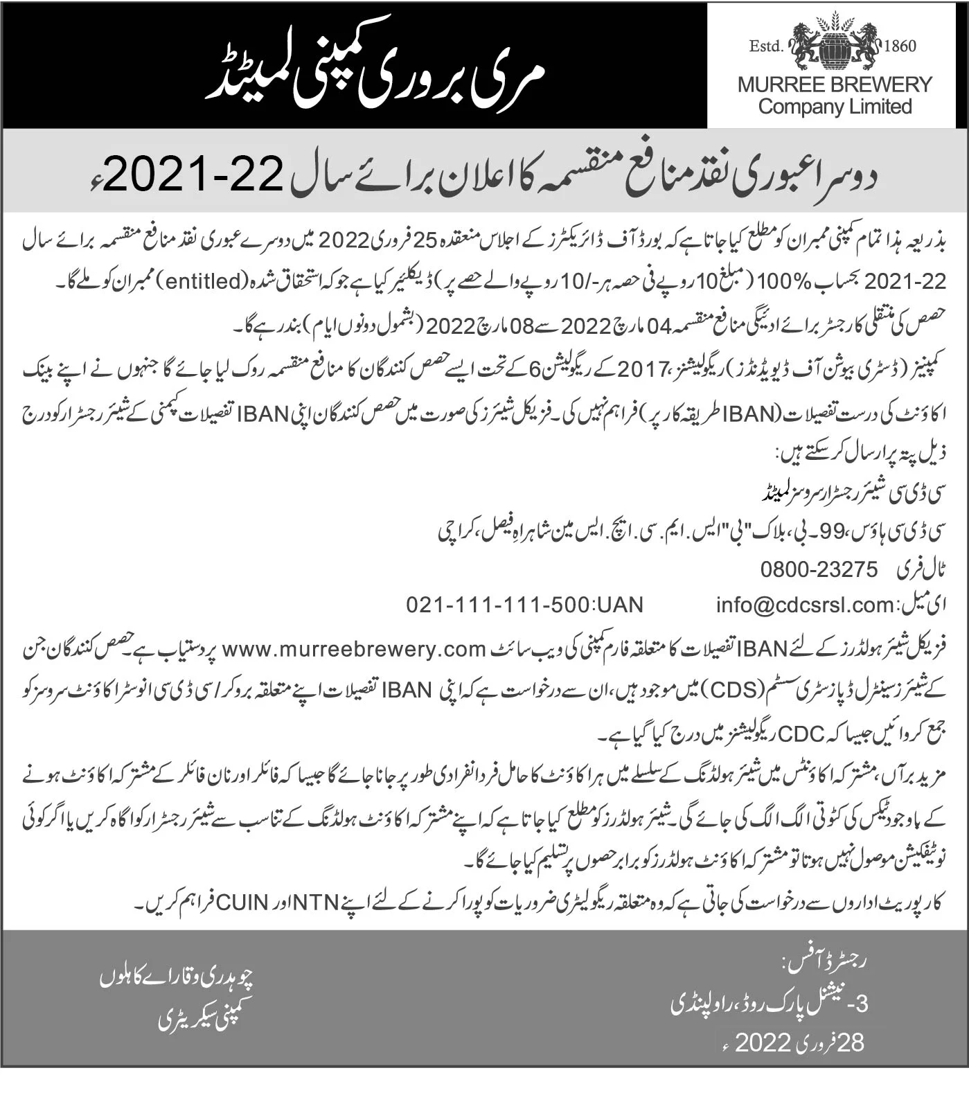 Declaration of 2nd Interim Cash dividend-2021-22-Urdu
