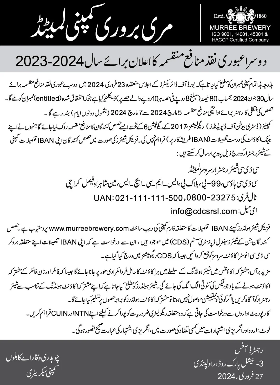 Declaration of 2nd Interim Cash dividend FY-2023-24 – Urdu