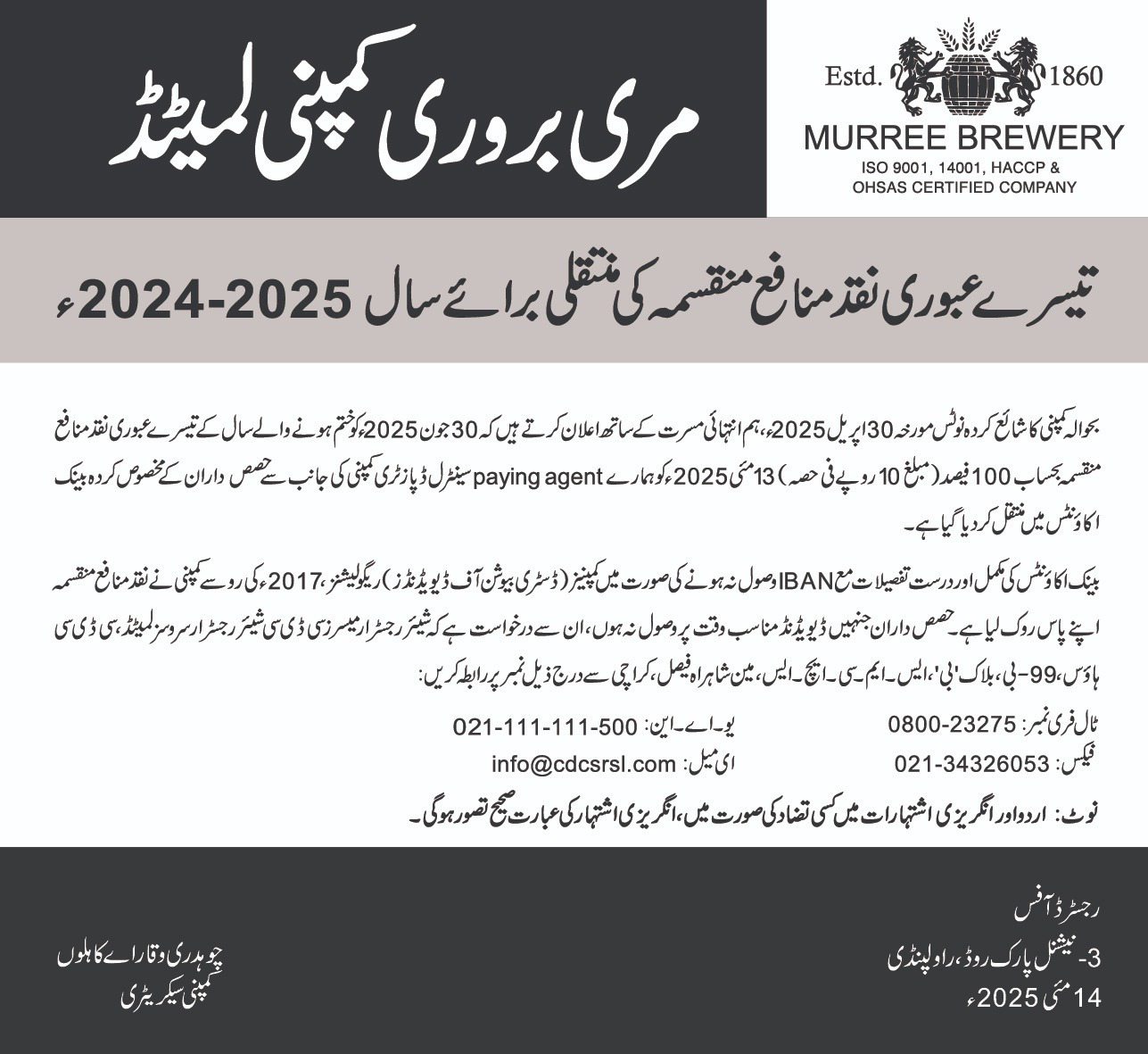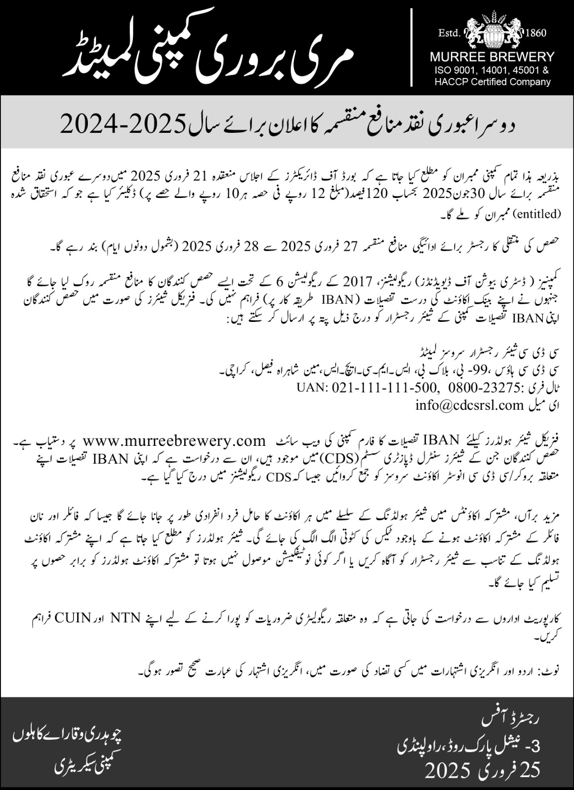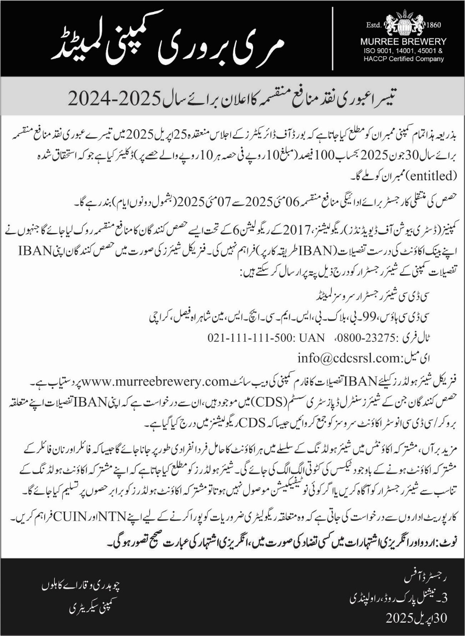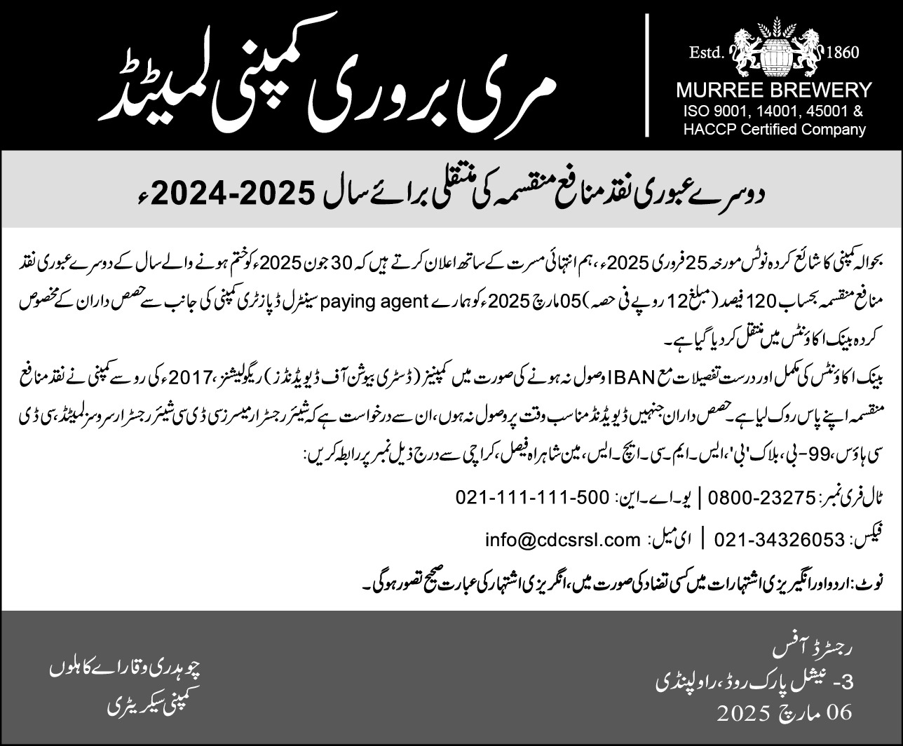 Declaration of 2nd Interim Cash dividend FY-2024-25 – Urdu